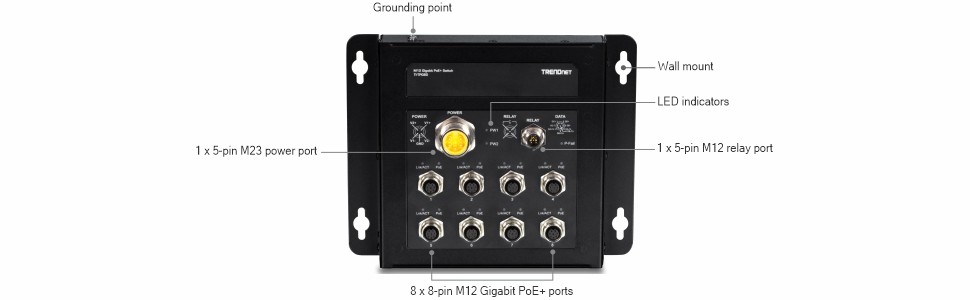 Eight M12 gigabit PoE+ ports deliver up to 30W of PoE+ power per port with a total power budget of 200W@48V DC, or 100W@24V DC