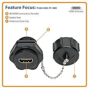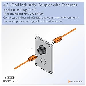 The Tripp Lite P569-000-FF-IND 4K HDMI coupler connects industrial-grade high-speed HDMI cables in outdoor applications and other areas where protection from harsh elements is essential, such as factories and warehouses. The industrial bulkhead adapter features two female HDMI connectors. It is designed to withstand dust, debris and moisture that could threaten your IT infrastructure. An included dust cap protects the connectors when they aren’t in use.