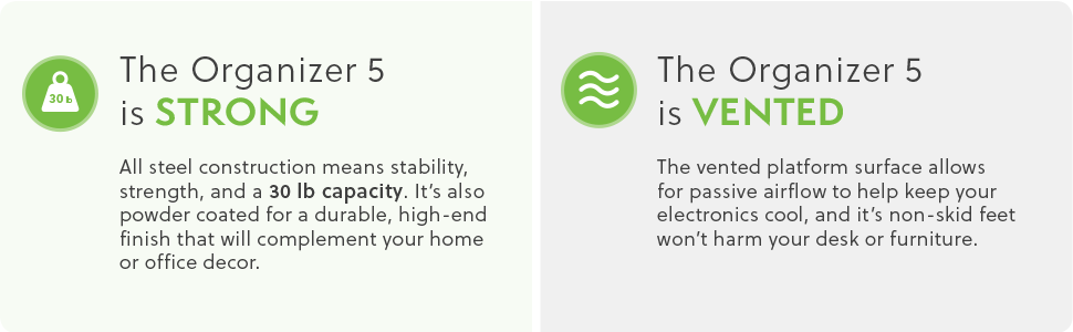 Protective non-slip feet keep the stand firmly in place and prevent scuff marks. The steel construction and durable powder-coated finish ensure that this monitor stand will provide organization and ergonomic comfort for years.