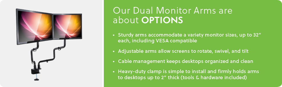 The quick and easy clamp mounting system fits a variety of desks (up to 2 inches thick) and the monitor arms can be assembled and installed in just minutes.
