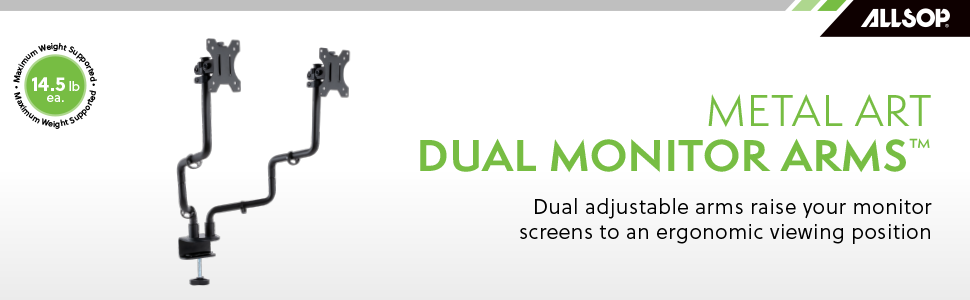 Ideal for freeing up space on desks, the Allsop Metal Art Dual Monitor Arms allow users to position their dual monitor setups for optimal viewing and ergonomic comfort. These dual monitor arms feature a sleek minimalist design while offering superior stability and adjustability.