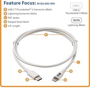 This high-quality cable connects your iPhone, iPad or iPod to your USB-C or Thunderbolt 3 laptop, MacBook, Chromebook or wall charger. It supports USB 2.0 speeds up to 480 Mbps and is backward compatible with previous USB generations. Typical Applications