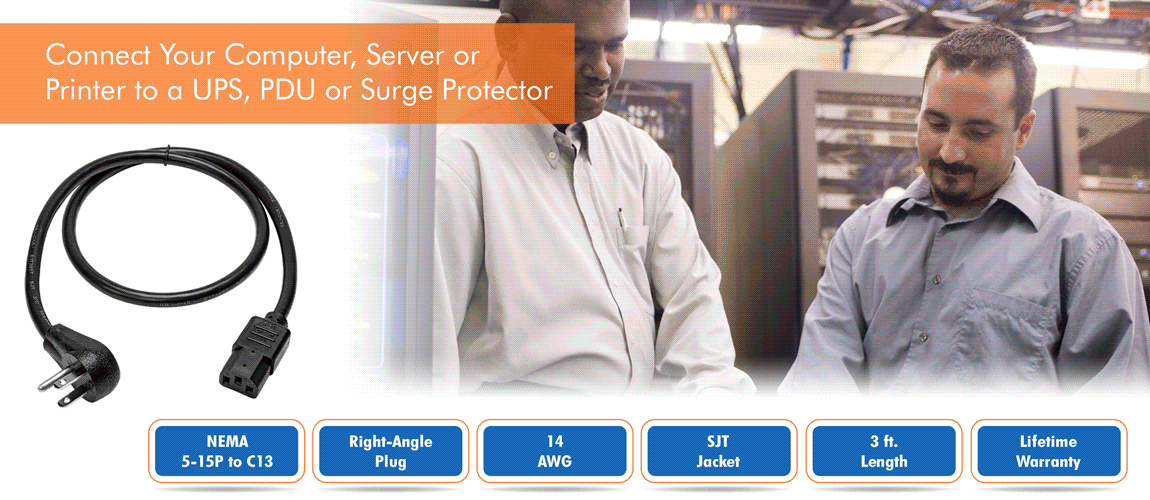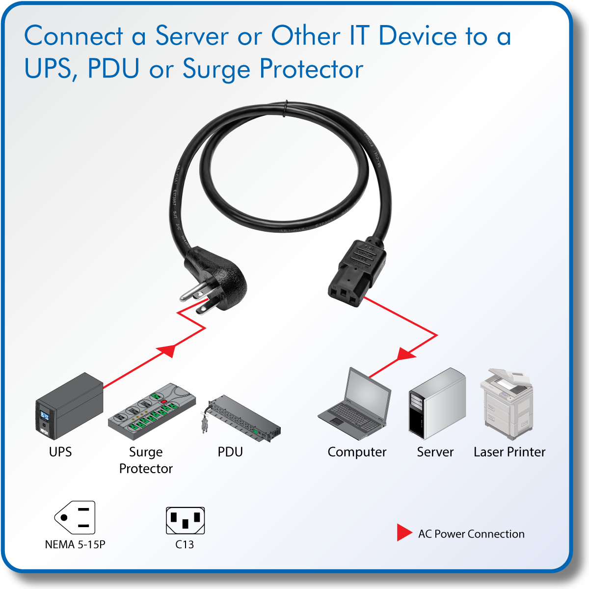 Tripp Lite’s P007-003-15D features one NEMA 5-15P connector and one C13 connector. Plug the 5-15P end into a UPS, PDU or surge protector and connect the C13 end to a computer, server, laser printer, scanner or other office/IT device. With this durable, affordable cable, you can extend your power connection by 3 ft. or replace a worn-out or missing cord.