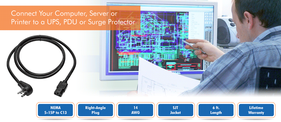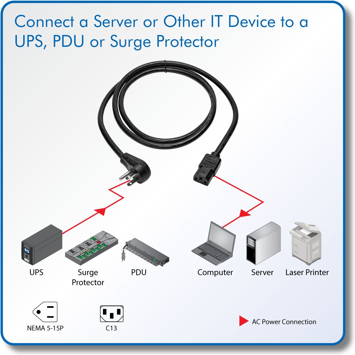 Tripp Lite’s P007-006-15D features one NEMA 5-15P connector and one C13 connector. Plug the 5-15P end into a UPS, PDU or surge protector and connect the C13 end to a computer, server, laser printer, scanner or other office/IT device. With this durable, affordable cable, you can extend your power connection by 6 ft. or replace a worn-out or missing cord.