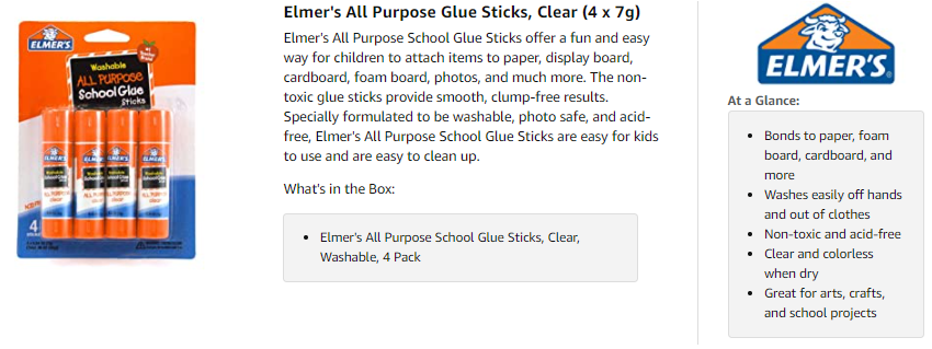 Children can glue on items quickly with Elmer's All Purpose School Glue Sticks. Designed to go on smoothly, the glue dries quickly and is clear when dry.