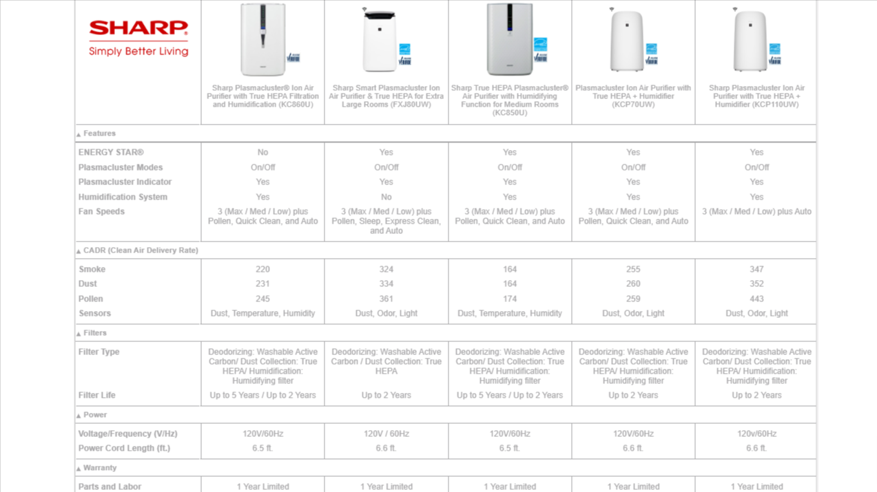 Raise your expectations of an air purifier and ensure a lower total cost of ownership over the years. Other brands may suggest replacing the filters every six months; that can really add up! Both the SHARP long-life True HEPA filter and the long-life Activated Carbon filter last up-to 5 years, depending on the environment.