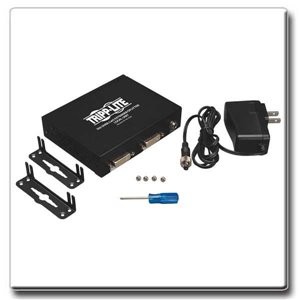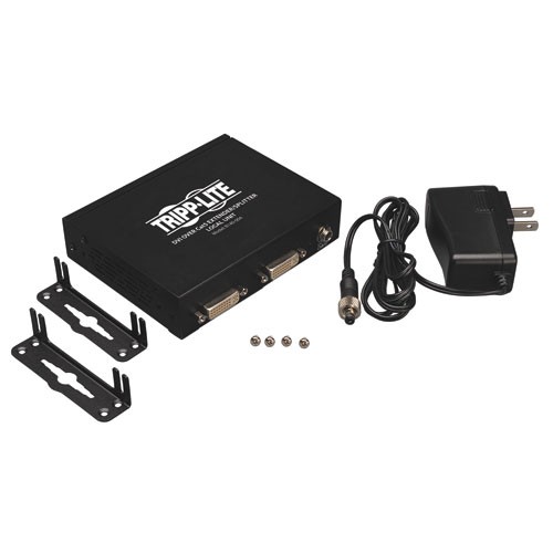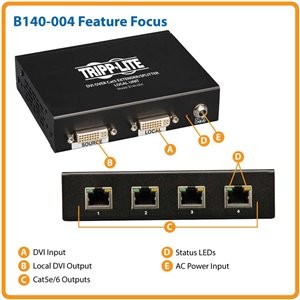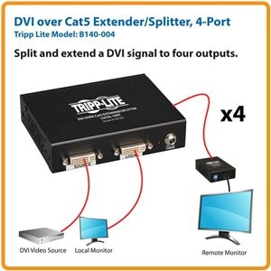 The B140-004 4-port DVI over Cat5 Extender/Splitter Transmitter splits and extends a single-link DVI-D signal to four monitors or projectors up to 200 ft. away over efficient Cat5e/6 cabling. Together with remote receivers (sold separately), it creates an ideal solution for digital signage applications ranging from retail displays to tradeshow presentations. The B140-004 transmitter allows the DVI source to be secure and hidden while delivering a high-resolution signal to distant monitors. The included mounting hardware provides a variety of installation options, and plug-and-play setup makes installation quick and easy. For peace of mind, the transmitter comes with a one-year warranty, is TAA-compliant for GSA Schedule purchase, and is designed according to strict RoHS standards.