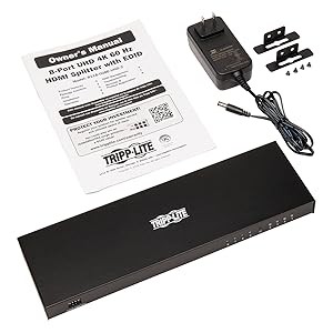 With no software or drivers required, the B118-008E-UHD-2 is completely plug and play. Simply connect your source and displays to the splitter using HDMI cables (such as Tripp Lite’s P568-Series, sold separately), then plug the included power supply into an AC outlet. An array of LEDs will illuminate to let you know the splitter is receiving power and your displays are connected. Use the included hardware to mount the unit to a desktop or wall.