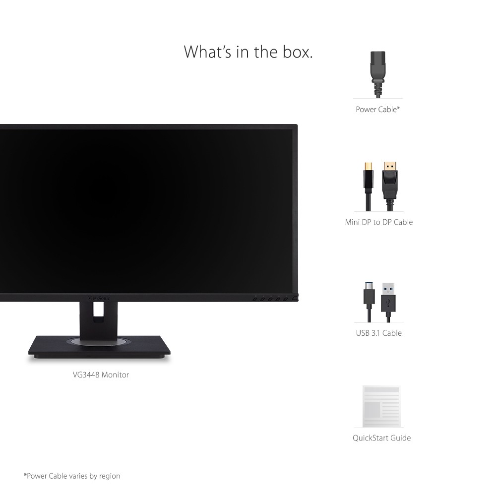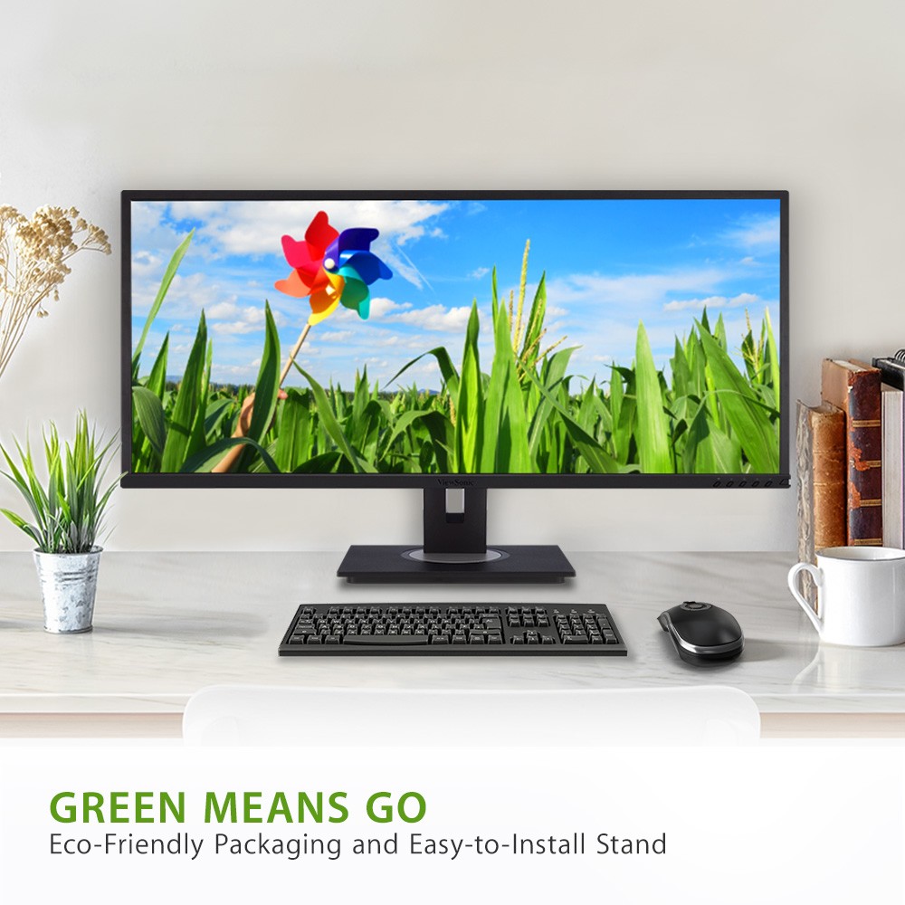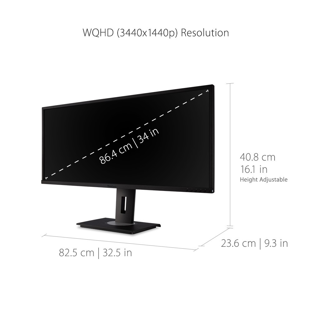 Featuring an ultra-wide 34” screen, the ViewSonic ® VG3448 monitor is ideal for both office use and home entertainment. With WQHD 3440 x 1440 resolution, the VG3448 delivers 2.4 times more pixels than standard Full HD monitors, giving users more detail for work or play. A 21:9 aspect ratio and slim bezels provide extra screen real estate so users can display more content, switch between applications more quickly, view documents side by side, and view multiple windows at once. This monitor is also shipped in eco-friendly biodegradable packaging, along with an easy-to-install quick release stand that makes for simple out-of-the box setup. The quick release stand also includes an integrated client mount and cable management features, making this monitor perfect for deployment in cloud-based environments.