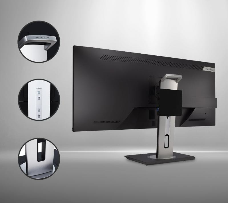 An easy-to-install quick release stand with a convenient carrying handle makes for simple monitor setup, while cable management features keep workspaces neat and free of cable clutter. The stand also features a built-in client mount for quick installation of client devices on the back of the monitor. This allows for simple client device deployment and a streamlined desktop without interfering with the ergonomic functionality of the monitor.