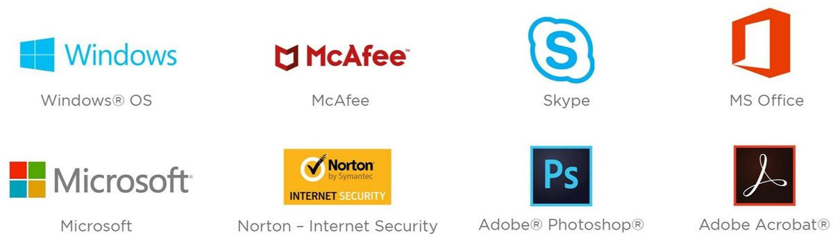 Windows® OS, Lenovo™ SHAREit, Lenovo OneKey™ Recovery, Lenovo REACHit, Lenovo Photo Master, McAfee® LiveSafe™ (30-day trial), Adobe® Photoshop® software, Adobe Acrobat® software, Cyberlink Power DVD, Chrome OS, Dropbox, Intuit Quickbooks, McAfee, MS Office, Windows, MS Works, MS Works Plus 2008, Norton AnitVirus, Norton Internet Security, Roxio Creator, Skype.