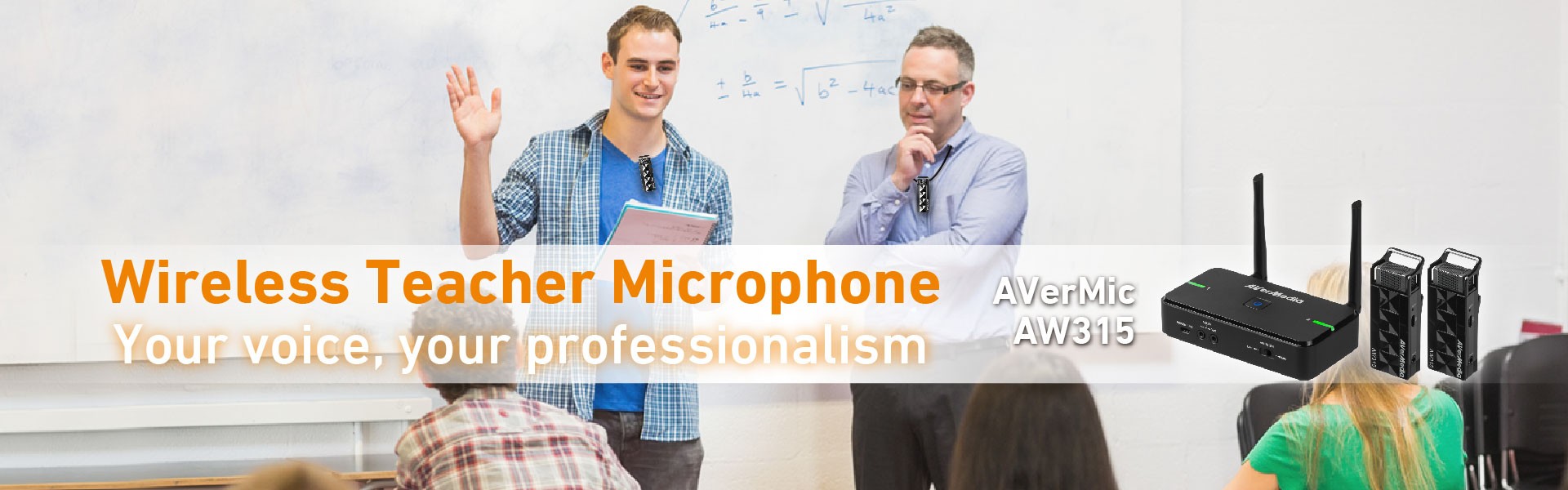 AVerMic AW315 provides reliable operation with its dual-antenna to two wireless microphones. With 2.4 GHz wireless technology, noise and speaker buzz reduction, this hands-free design not only gives teacher total freedom to interact with students, it also delivers natural voice in great clarity and stability.