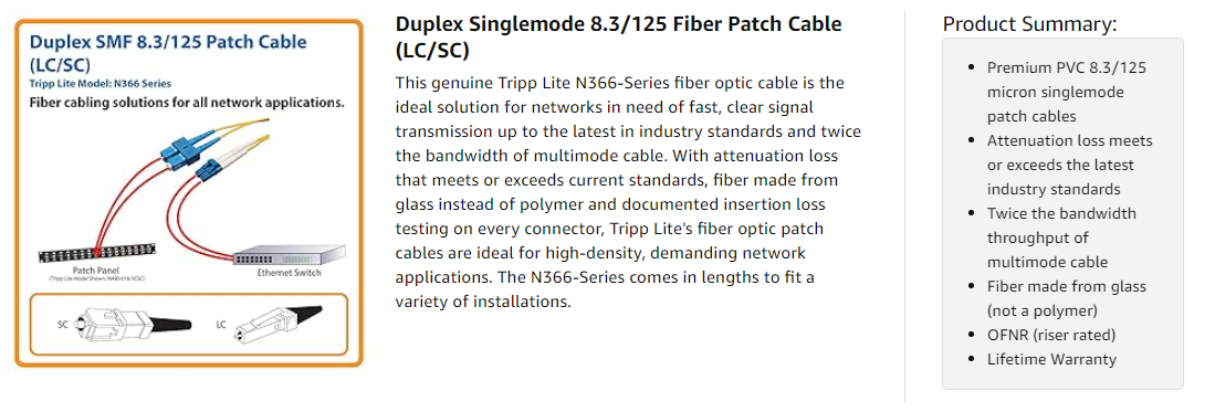 The N366-Series is manufactured using top quality materials. With 8.3/125 duplex fiber, a FDDI and OFNR-rated PVC jacket, sturdy connectors and fiber made from glass instead of a polymer, Tripp Lite's fiber optic cables are made to last in high-demand data center and networking applications.