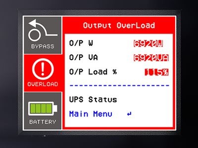 Auto-rotating, multi-function color LCD screen clearly shows status of UPS and power. LCD provides UPS status, controls, most recent event logs, and diagnostics.