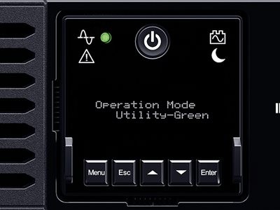 The LCD screen tilts and rotates to provide better view angles depending on how the UPS is mounted. Provides information for the UPS status, UPS setup control management, and testing options.