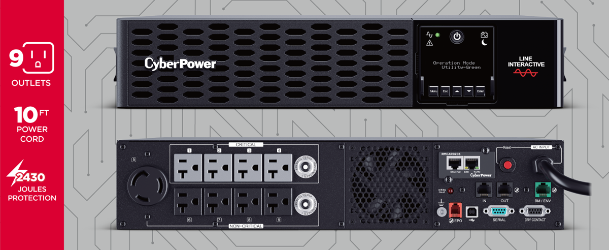 This unit is equipped with nine battery and surged protected outlets. Four outlets provide critical load protection to safeguard critical equipment.