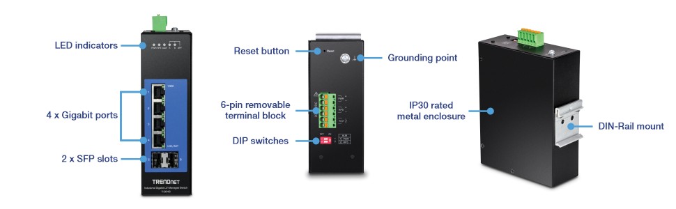 TRENDnet's Industrial Gigabit L2 Managed DIN-Rail Switch series offers advanced layer 2 managed features with enhanced traffic controls to meet the evolving demands of today's SMB networks. Each industrial layer 2 managed switch is equipped with an IP30 rated metal enclosure, designed to withstand a high degree of vibration and shock, while operating within a wide temperature range of -40° – 75° C (-40° – 167° F) for industrial environments. Our industrial layer 2 managed switch models feature copper Gigabit ports for high-speed device connections, and SFP slots that support both 100Base-FX and 1000Base-FX modules for long distance fiber networking applications.