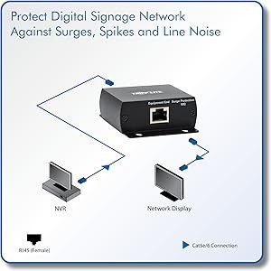 Tripp Lite’s B110-SP-CAT In-Line Surge Protector fits right into your digital signage network installation. Simply connect it between your source and network equipment using Cat5e/6 patch cables and protect your source and device against damage caused by lightning and electrostratic discharge (ESD). To protect both source and device, two surge protectors are required.