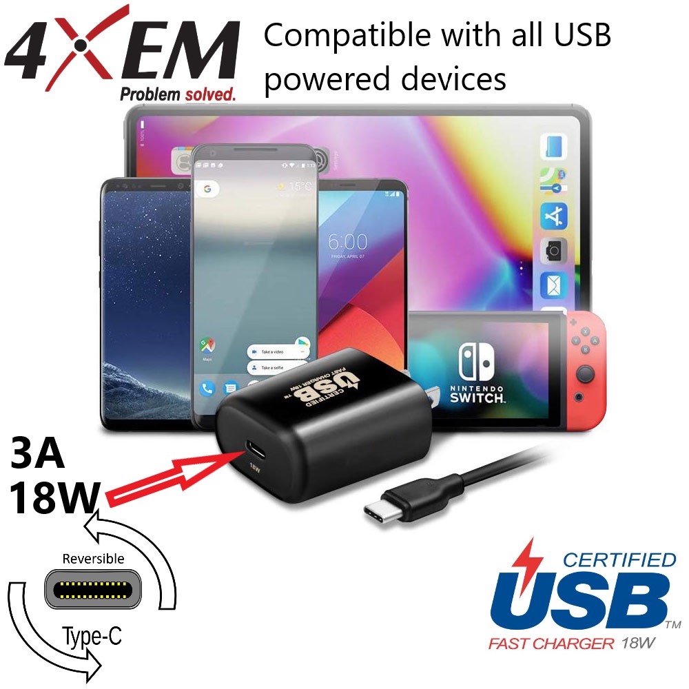 4XEM USB-C 18W PD High Speed USB C Wall Charger is completely compatible with all USB powered devices. With high speed charging, our 18W 3A wall USB Type C wall charger will supply the quick battery boost when you need it. 4XEM's USB C power block delivers a full 18W charging power via the USB-C female port in tandem with one of our many USB-C cables to juice up your mobile phone, tablets or any USB powered devices. Our certified Fast Charging USB-C wall charger is designed with high quality material for strength and durability.