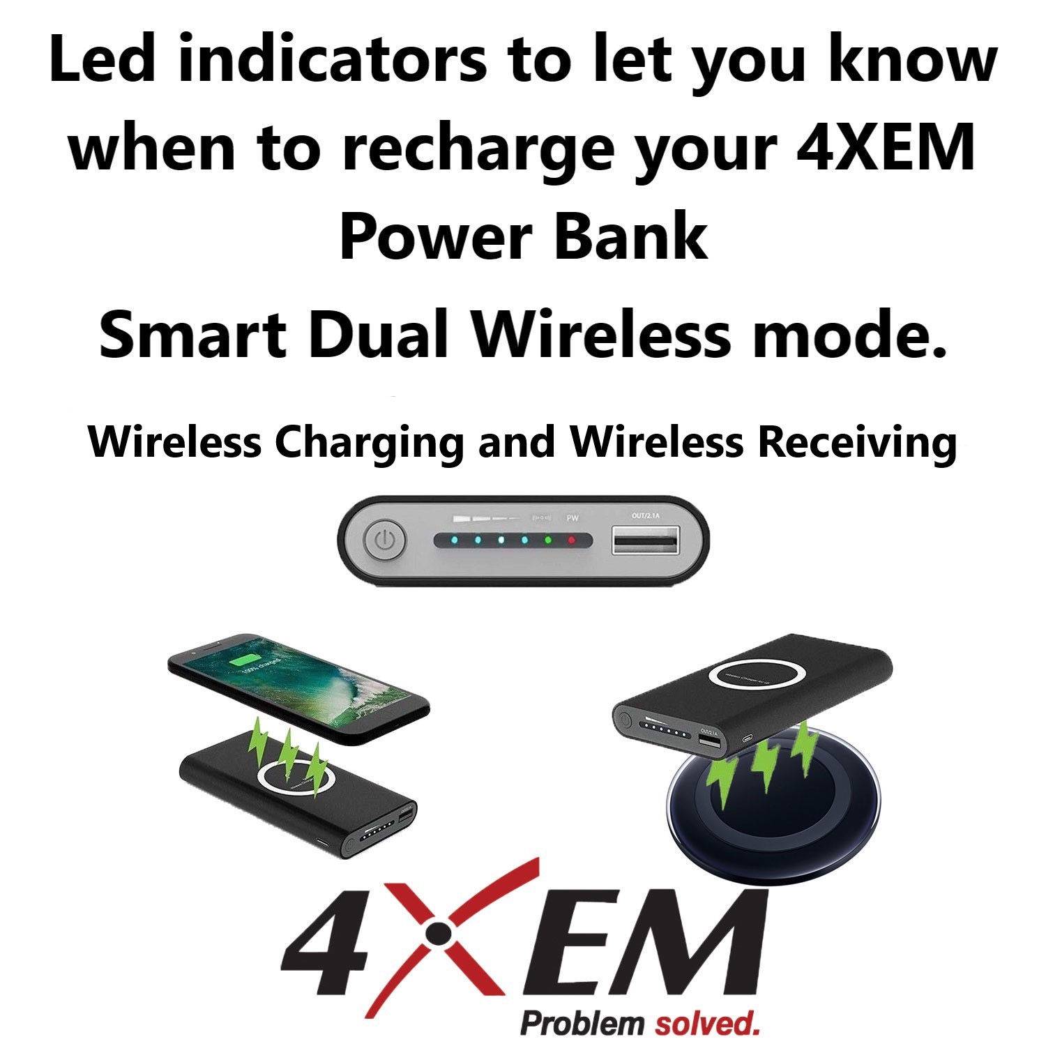 Our Qi certified wireless power banks dual charge. Smart dual wireless mode allows you to wireless charge or wireless receive power. Simply place your wireless power bank on one of our wireless Qi chargers (4XWRLSCHARGERBK OR 4XWRLSCHARGERWH) to charge the internal battery, or charge it with your USB C, micro USB PORT. With a capacity of 10000mAh our Qi wireless power bank will have you charged back up in no time. Use it with any Qi enabled device and power up your Samsung or iPhone on the run. The Samsung wireless power bank can charge 2 devices at once.