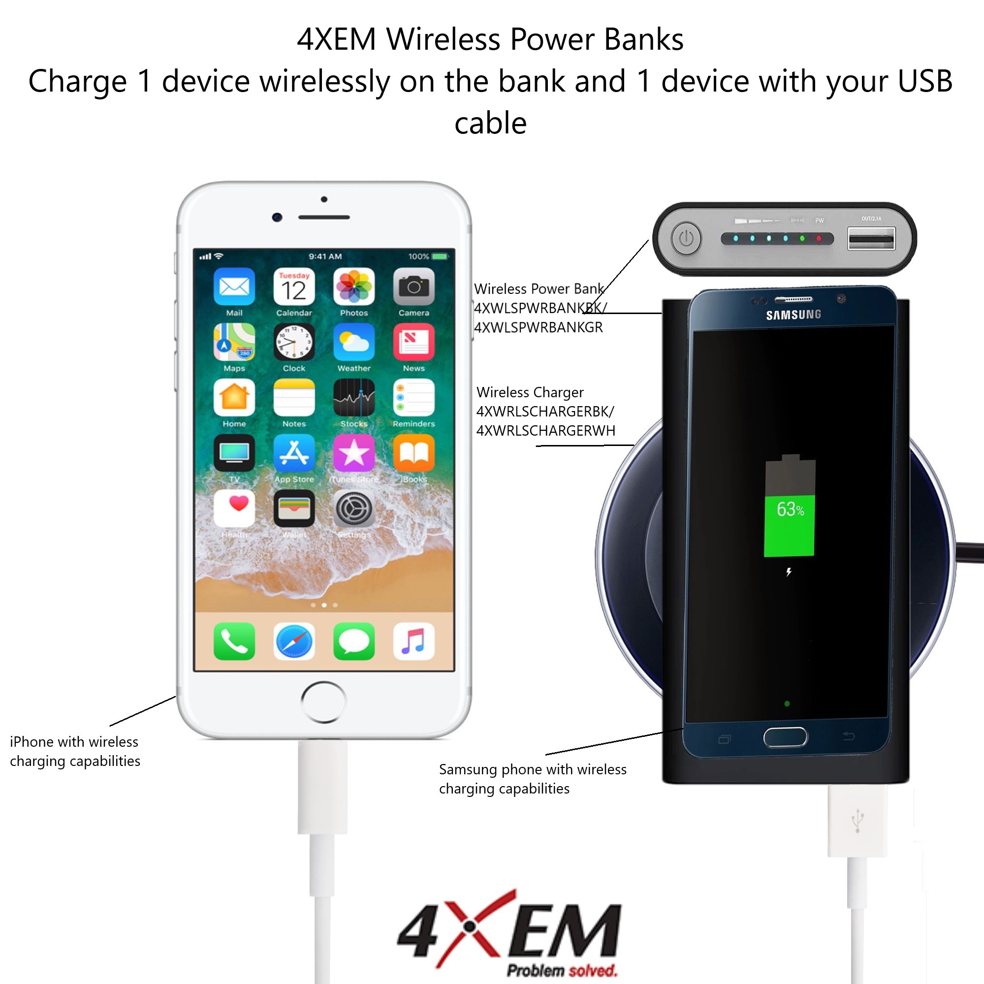 Our wireless power bank for iPhone or Samsung will charge one device with the USB port and one device wireless at the same time.