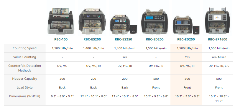 The RBC-ED250 gives the user the added ability to track the cumulative value of the currency counted. Simply select the dollar denomination for each stack prior to counting. When all stacks are complete, the RBC-ED250 provides the total number of bills and values of each denomination along with a grand total amount. Let this money counting machine do the work for you.