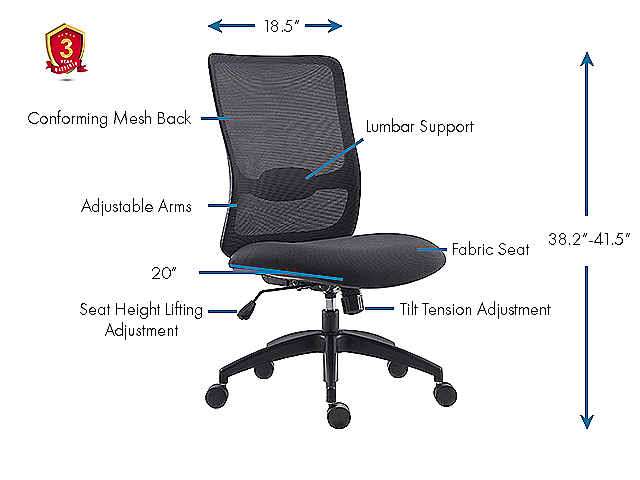 From the Lorell SOHO Collection, the armless staff chair fits under most small home office work stations and tables. The Staff Chair features a comfortable mesh back with lumbar support and swivel tilt for ease of use. The seat is upholstered in easy to clean black nylon fabric.