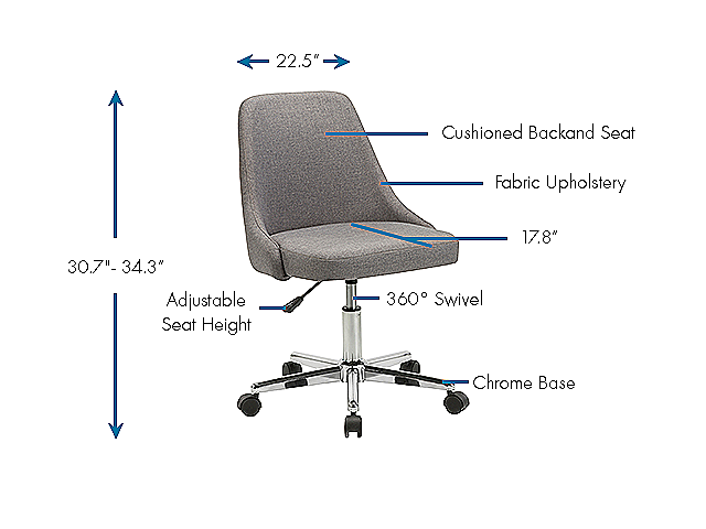 This mid-century modern inspired task chair with no arms is a welcome addition to your office. The cushioned seat and back are upholstered in a rugged but stylish gray fabric for years of worry free use. The simple and convenient design features include a 360 degree swivel and seat height adjustment facilities. The five star chrome base is equipped with smooth rolling casters for easy mobility.