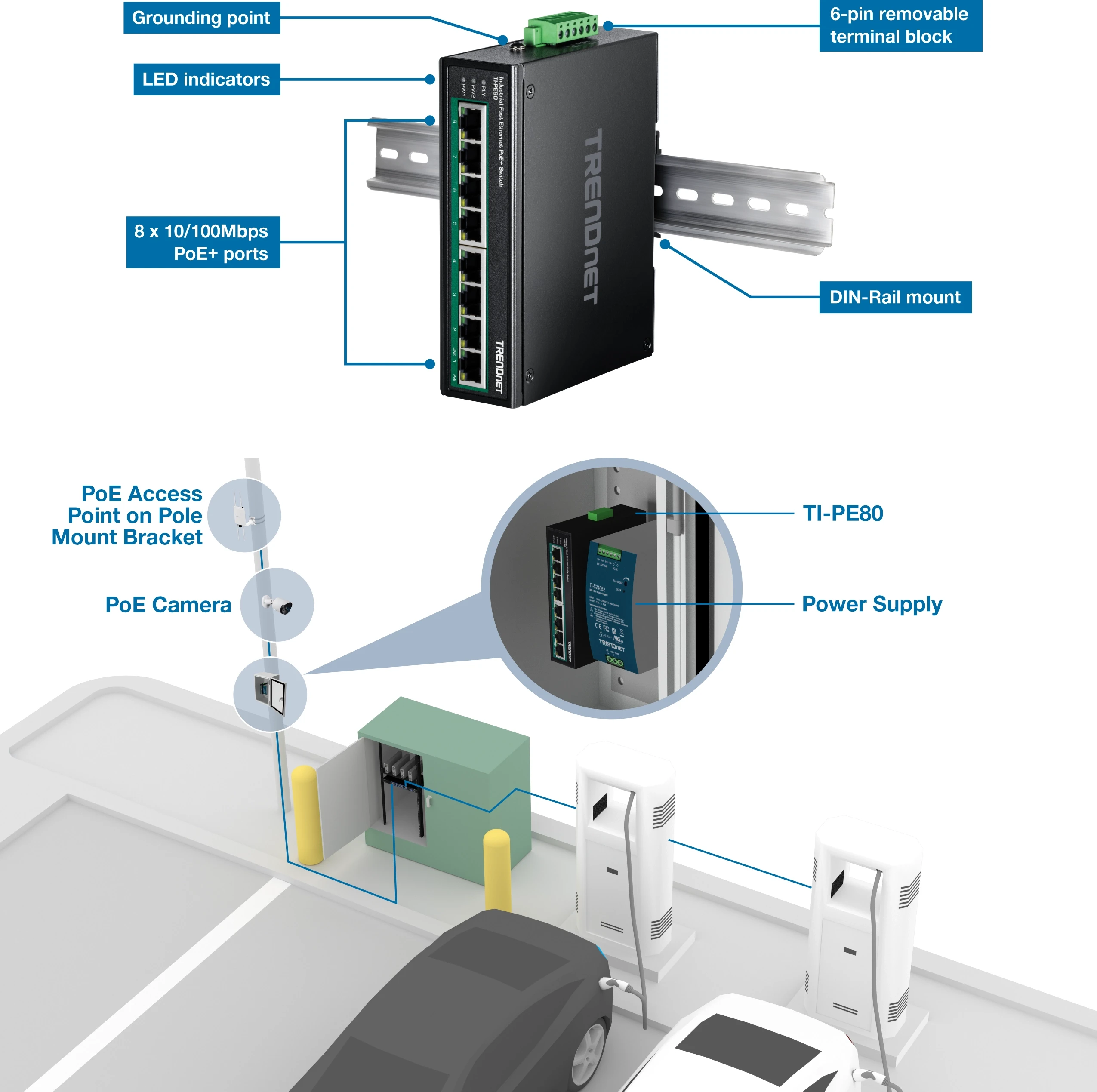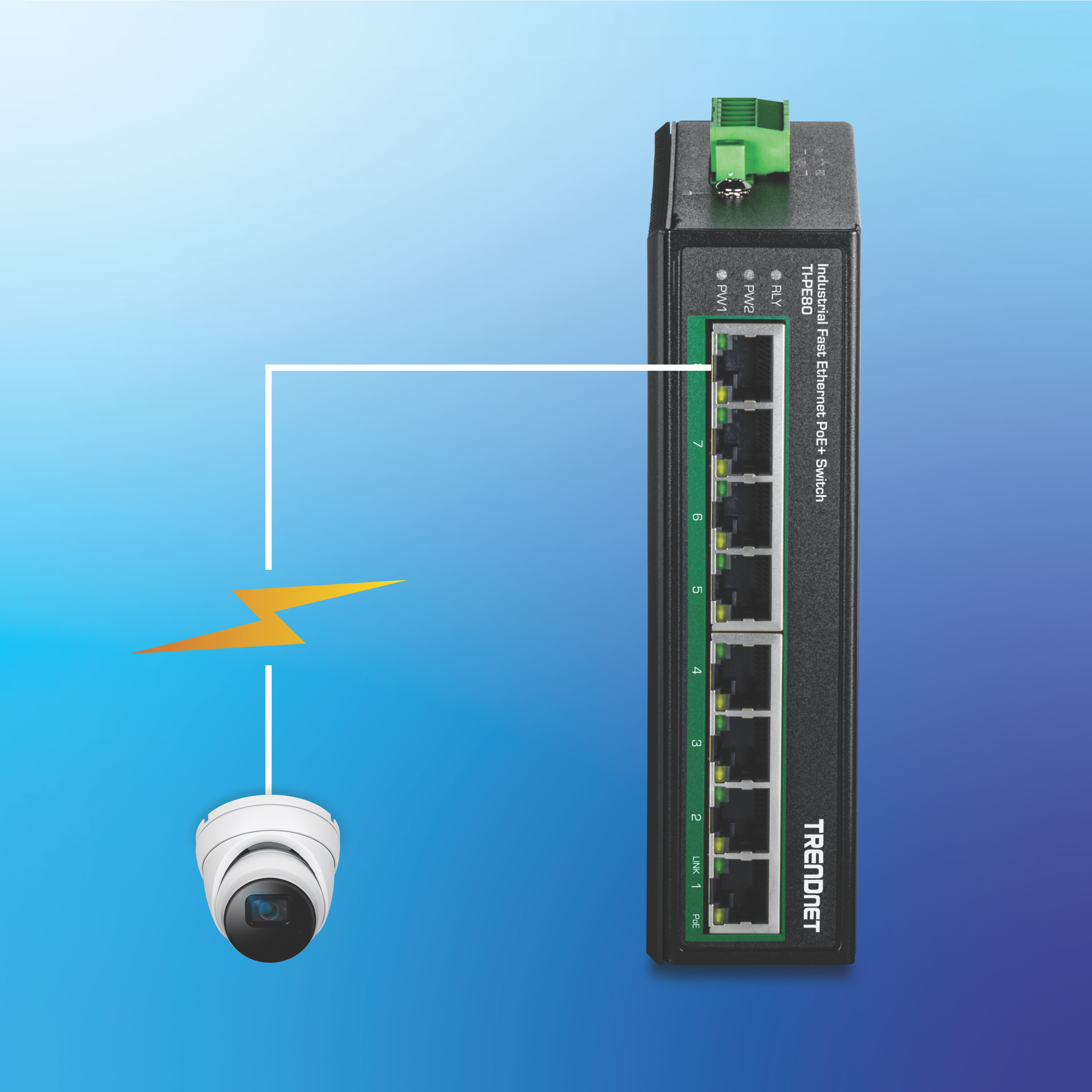Installers and integrators can save on equipment costs and reduce installation time with TRENDnet’s Industrial Fast Ethernet PoE+ Switch by delivering up to 30W per port of PoE power and data over existing Ethernet cables. With PoE technology, users only need one cable to deliver both data and power from the industrial unmanaged PoE+ switch. Utilize TRENDnet's industrial PoE+ switch to easily network PoE devices, such as high-power wireless access points, PTZ and other advanced IP cameras, VoIP phone systems, IPTV decoders, access controls, and more.