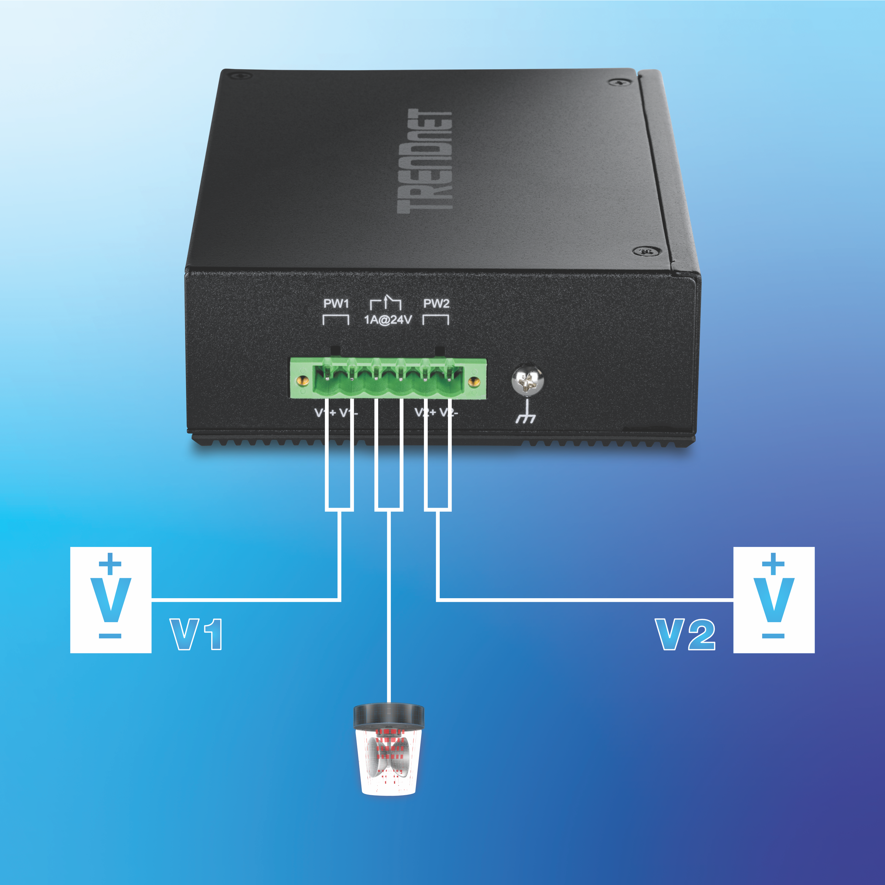 Dual inputs provide redundant power with overload current protection (power supply sold separately, model: TI-S24052)