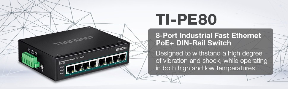 TRENDnet’s 8-Port Industrial Fast Ethernet PoE+ DIN-Rail Switch, model TI-PE80, features a rugged IP50 rated metal enclosure. This industrial unmanaged PoE+ switch is designed to withstand a high degree of vibration and shock, while operating in both high and low temperatures for industrial environments within -40° – 75° C (-40° – 167° F). Redundant power inputs with overload current protection minimizes network downtime.