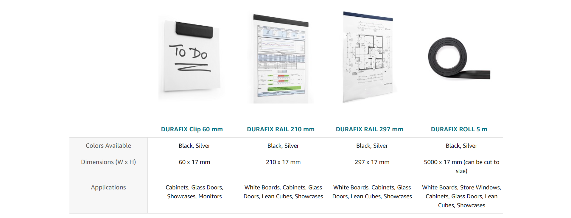 Everyone knows this: a note can be written quickly and attached to somewhere within eye shot so that you do not forget important appointments and information. The problem: the adhesive used in standard sticky notes quickly lose their strength and the notes become lost. DURAFIX CLIP has a clever solution: simply attach the self-adhesive clip to any smooth surface and clip in your notes. The magnetic strips will hold the notes securely in place. Freely swappable and reusable as often as you like!
