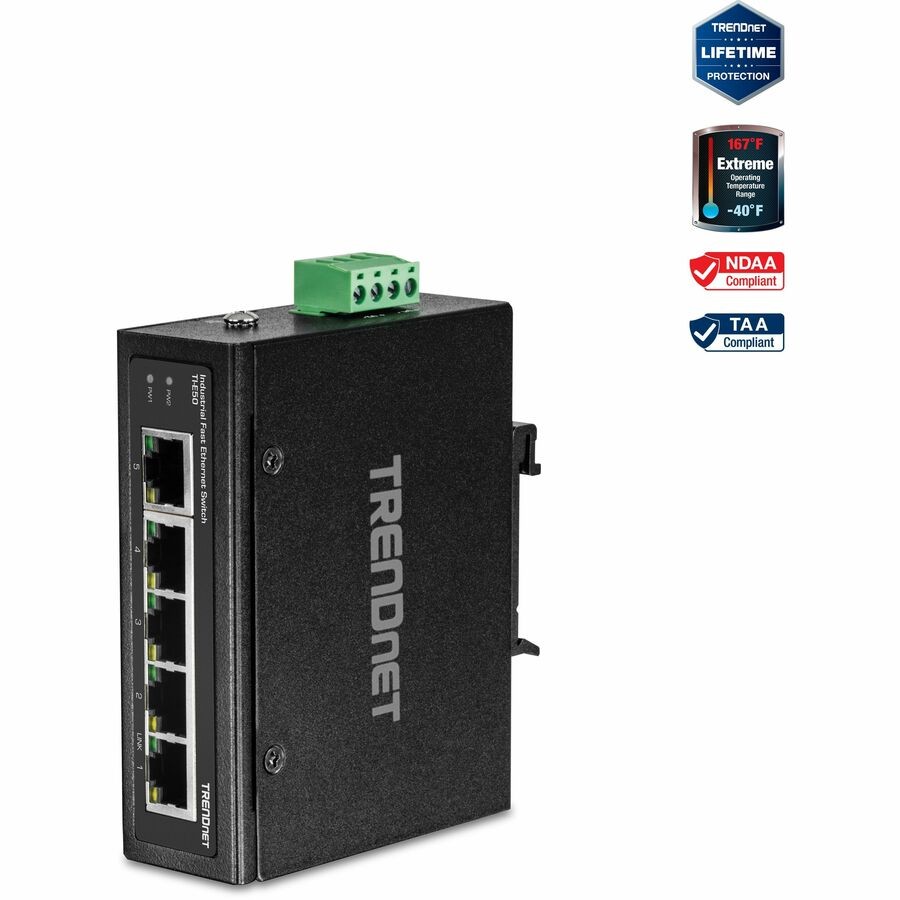 The industrial Ethernet switch features dual power inputs to provide redundant power with overload current protection.
