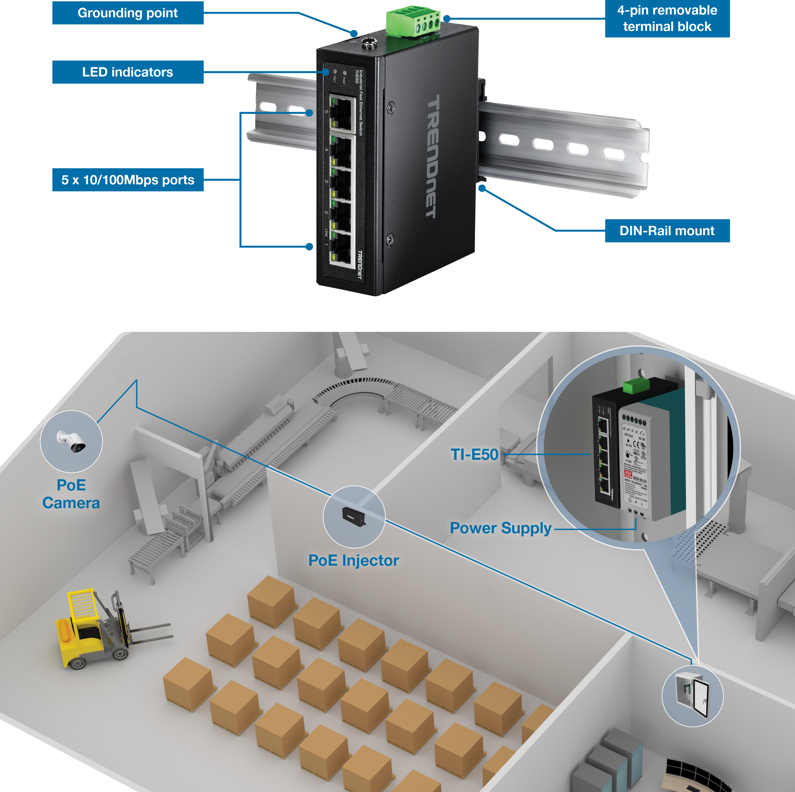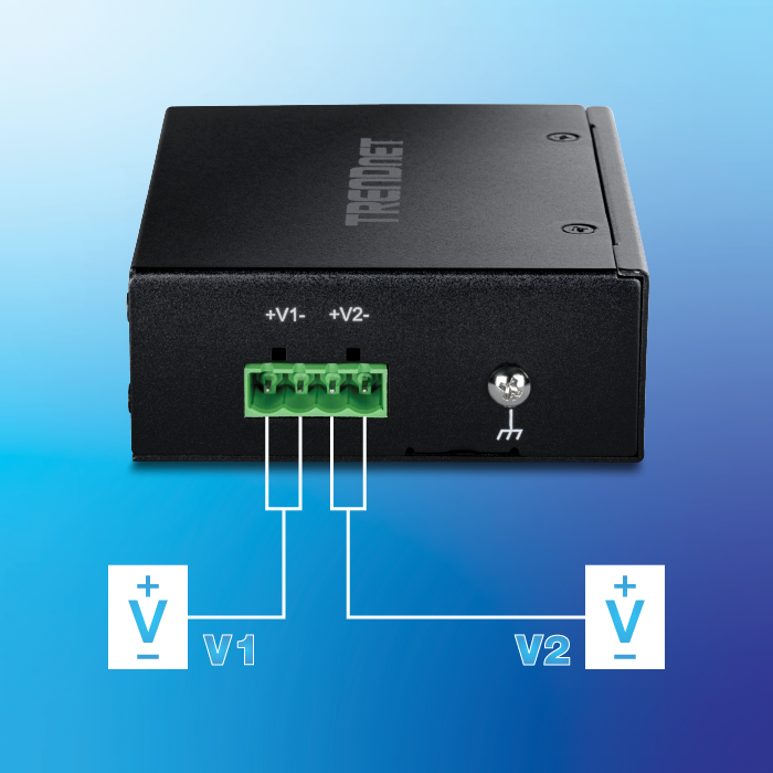 Dual power inputs provide redundant power with overload current protection (power supply sold separately, model: TI-M6024)