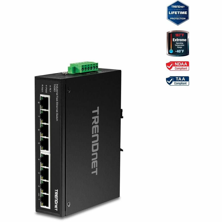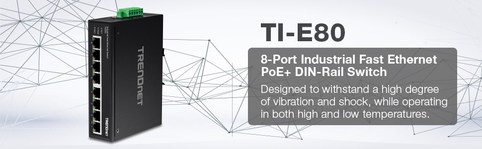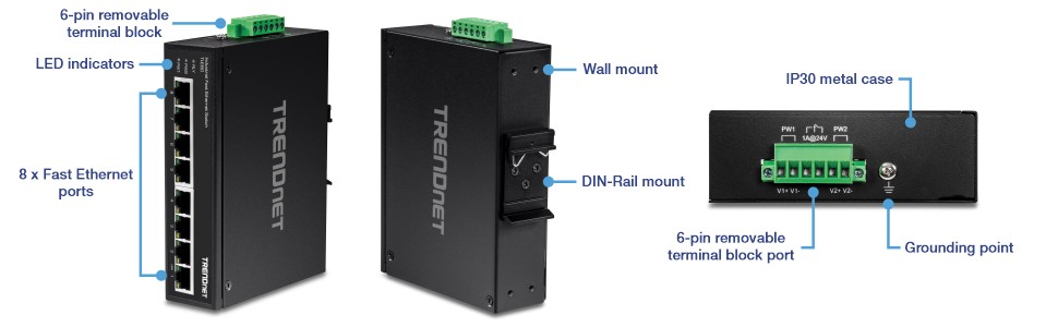 TRENDnet's Industrial Fast Ethernet DIN-Rail Switches feature a rugged IP30 rated metal enclosure. These industrial Ethernet switches are designed to withstand high levels of vibration and shock, operate in both low and high temperatures for industrial environments within a -40° – 75° C (-40° – 167° F) wide-temperature range. Redundant power inputs with overload current protection on each industrial Ethernet switch minimizes network downtime.