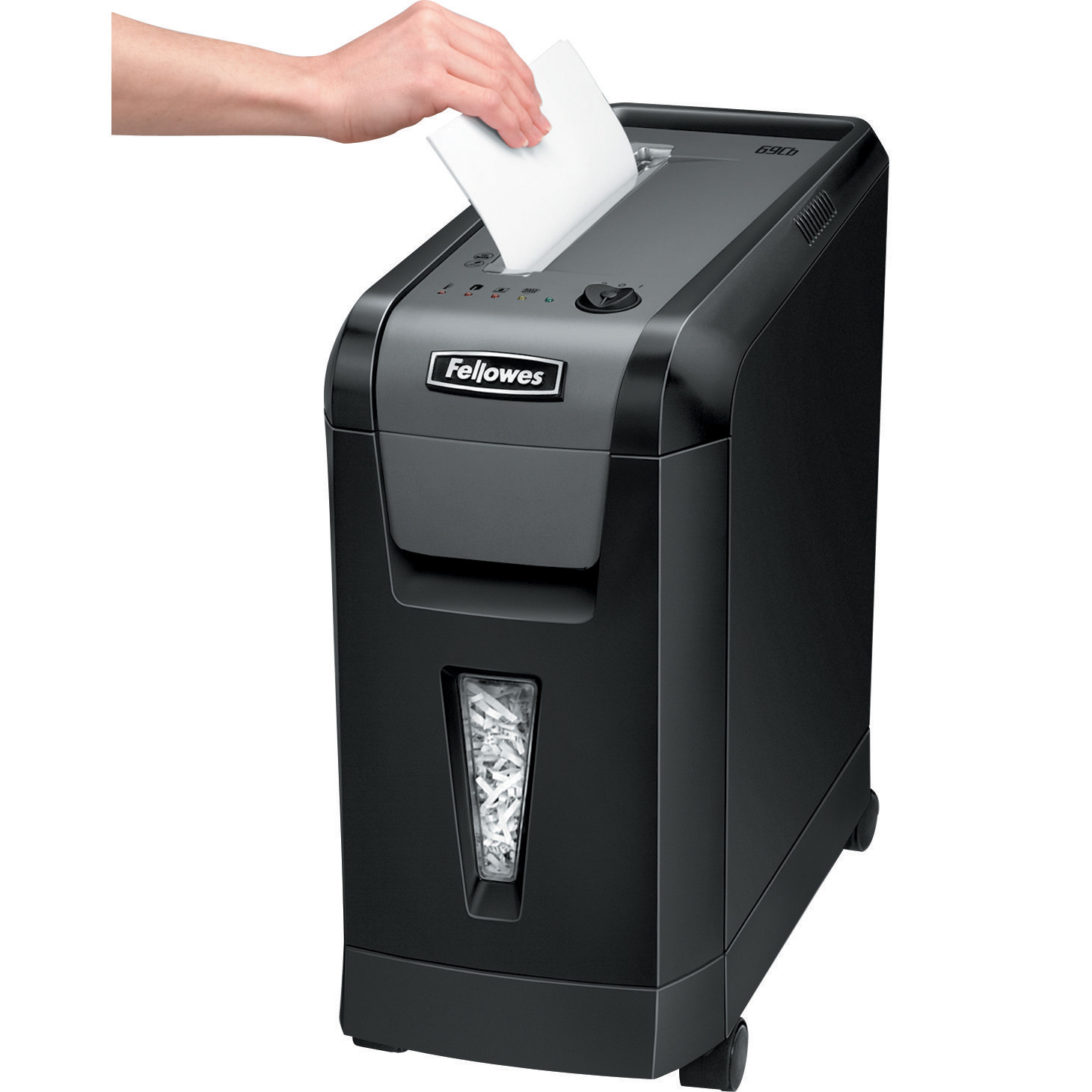 The Fellowes Powershred 69Cb Cross-Cut Shredder can shred up to 10 sheets of paper per pass into 307 (5/32” x 2” Security Level P-3) cross-cut particles. This machine also safely shreds credit cards, staples, and paper clips. Achieve hassle-free shredding with all the 69Cb has to offer including Jam Blocker Technology, blocking paper jams before they start. To protect more than your identity, the patented SafeSense Technology is designed with an electronic safety sensor that surrounds the paper entry and automatically disables the shredder when hands touch the paper opening. Also, the 69Cb’s SilentShred Technology and Energy Savings System allow this machine to integrate easily to any environment. With the ability to shred for up to 10 minutes before a cool down period is needed, the 69Cb is ideal for personal deskside use and includes a 5-gallon pull-out bin.