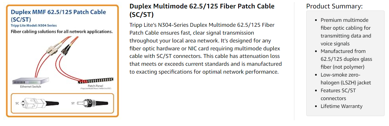 The N304-Series is manufactured using top-quality materials. It has 62.5/125 duplex (zipcord) fiber made from glass instead of a polymer, a low-smoke zero-halogen (LSZH) jacket, sturdy SC/ST connectors and is FDDI and OFNR rated. The LSZH jacket limits the amount of toxic smoke emitted in case of combustion and is perfect for poorly ventilated areas. The jacket is orange to distinguish the N304-Series from singlemode cables.
