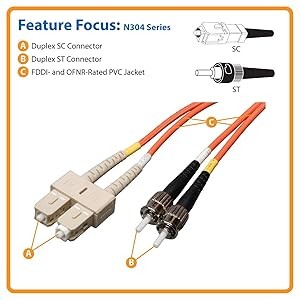 The N304-Series has dual SC/ST connectors that are widely compatible and thoroughly tested to meet stringent insertion loss standards. The connectors have beveled edges for a secure connection.