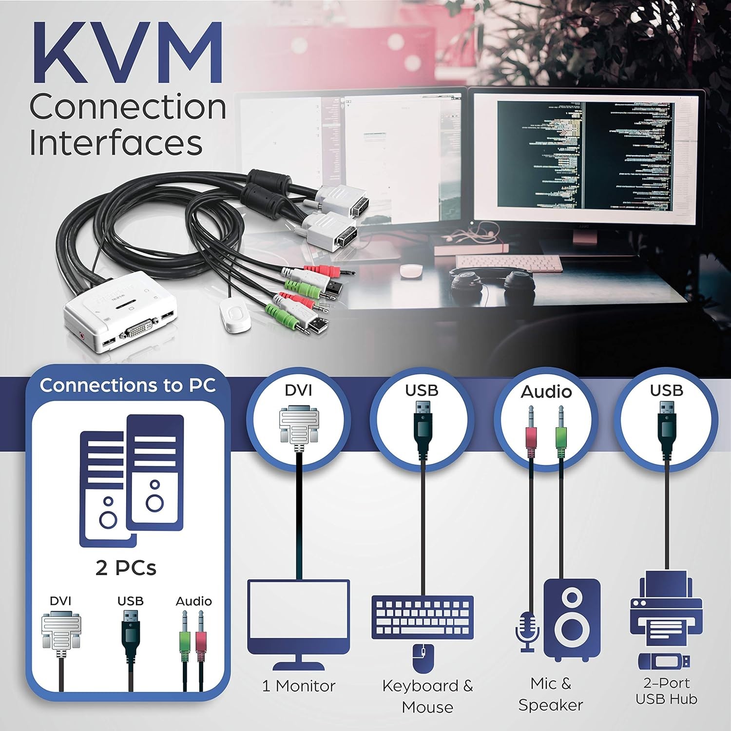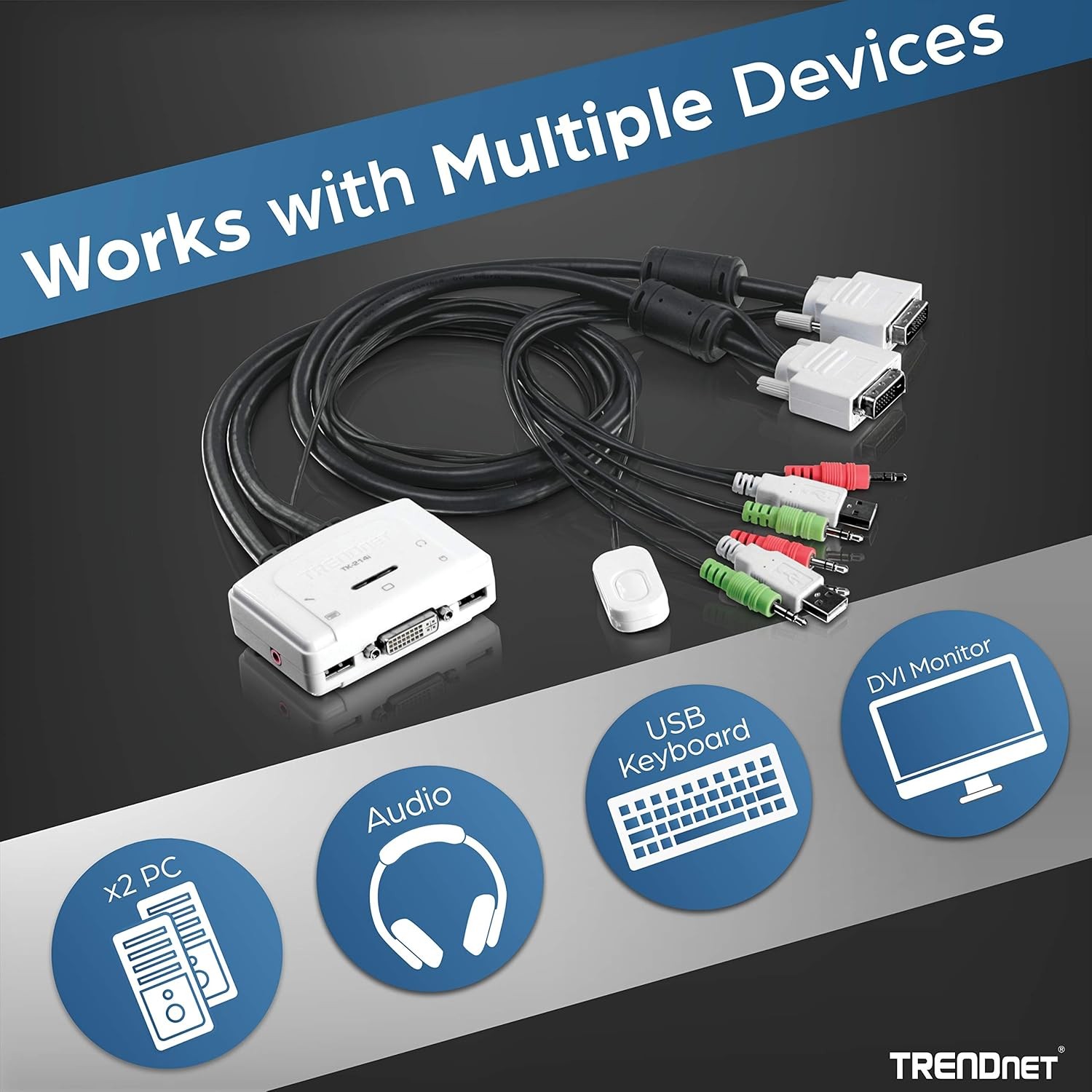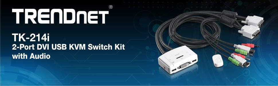 The 2-Port DVI USB KVM Switch Kit with Audio, model TK-214i, allows you to control 2 PC and/or Mac computers with one set of console controls. Manage laptops or desktops that have DVI, USB, and audio ports at the touch of a button with one set of USB keyboard, USB mouse, DVI monitor, microphone, and speakers. No driver installation required, simply plug in the devices to control 2 computers. A convenient toggle switch with a 1.5 m (5 ft.) extension cable can be placed in the most ergonomic location on your workstation.
