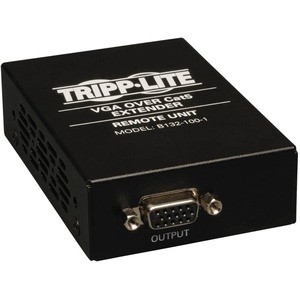 This genuine Tripp Lite VGA Over Cat5 Receiver works with a B132-002-1 or B132-004-1 local unit to extend a VGA video signal beyond the average 100-ft. distance limitation. The B132-100-1 can extend a 1024 x 768 (60 Hz) signal up to 1000 feet when using 24Awg Solid Wire Cat5e/6 cable (Tripp Lite N202-series), and supports a maximum resolution of 1920 x 1440 (60 Hz). For optimal image quality between 500 and 1,000 ft., use Zero-Skew cable, such as Tripp Lite P524-01K.