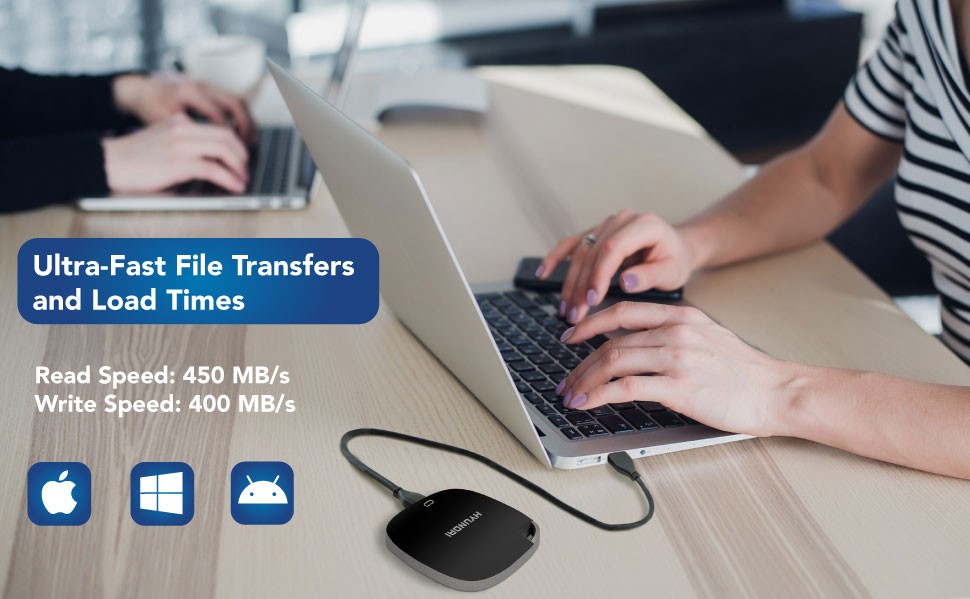 Indoors or outdoors, at home or at the office, the Hyundai External SSD is manufactured to be durable and portable. With rounded angles and the perfect size, our design and research team made sure this fits in most pockets. The Hyundai External SSD delivers high-performance and capacity in a drive that’s smaller than a smartphone offering a portable and compact design to fit your lifestyle. With a wide compatibility, get lightning fast, high-quality transfers and access to the files contained in your Hyundai External SSD.
