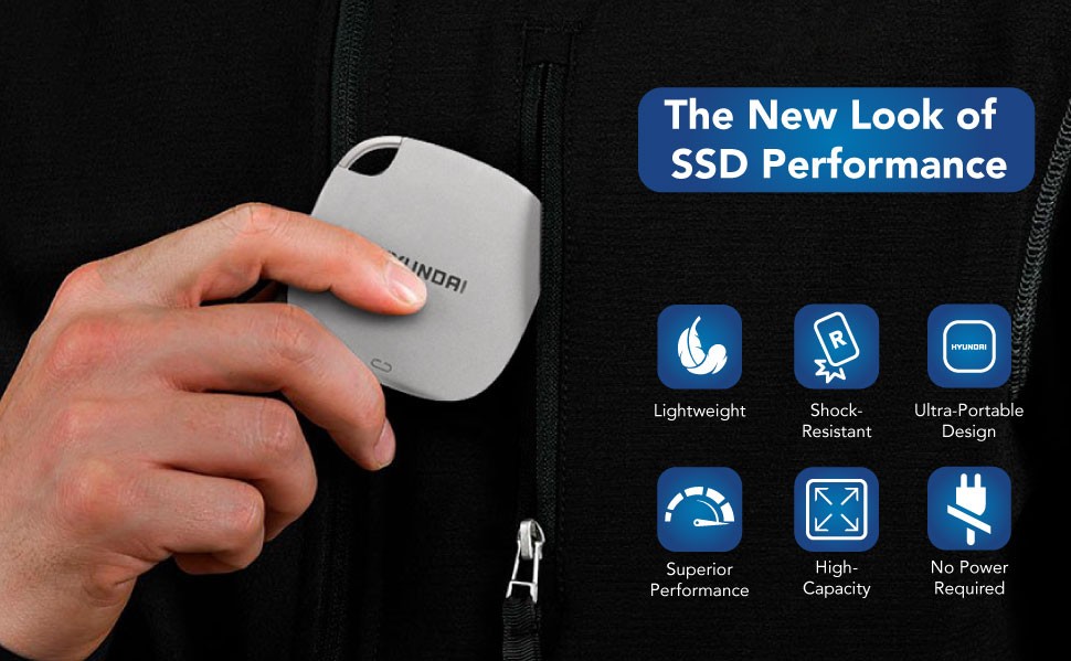 Indoors or outdoors, at home or at the office, the Hyundai External SSD is manufactured to be durable and portable. With rounded angles and the perfect size, our design and research team made sure this fits in most pockets. The Hyundai External SSD delivers high-performance and capacity in a drive that’s smaller than a smartphone offering a portable and compact design to fit your lifestyle. With a wide compatibility, get lightning fast, high-quality transfers and access to the files contained in your Hyundai External SSD.