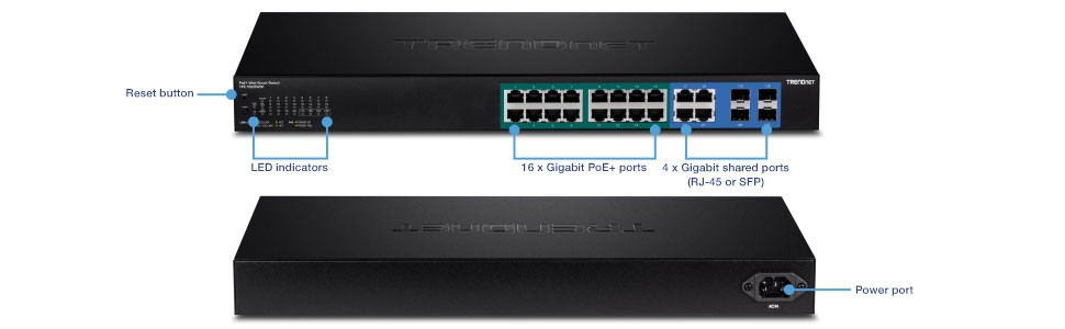 Hardware DesignProvides 16 gigabit PoE+ ports, 4 shared gigabit ports (RJ-45 or SFP), a 40Gbps switching capacity, and 1U 19” rackmount design with brackets included |