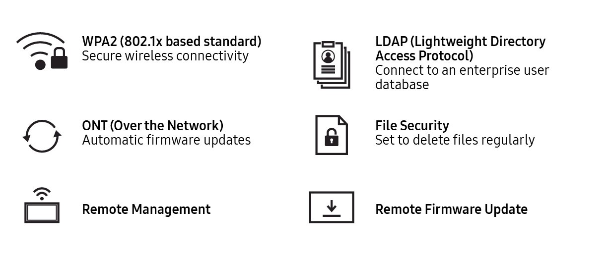 The Samsung Flip 2 offers a host of capabilities, including secure wireless connection, automatic firmware updates, LDAP synchronization, file security and remote management—helping to ensure a convenient and productive meeting experience.