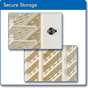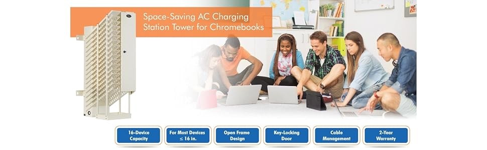 The front door locks to deter theft of devices without interrupting sight lines. Once the tower is secured against a wall, the outlets and power adapter shelves can only be accessed through the top panel.