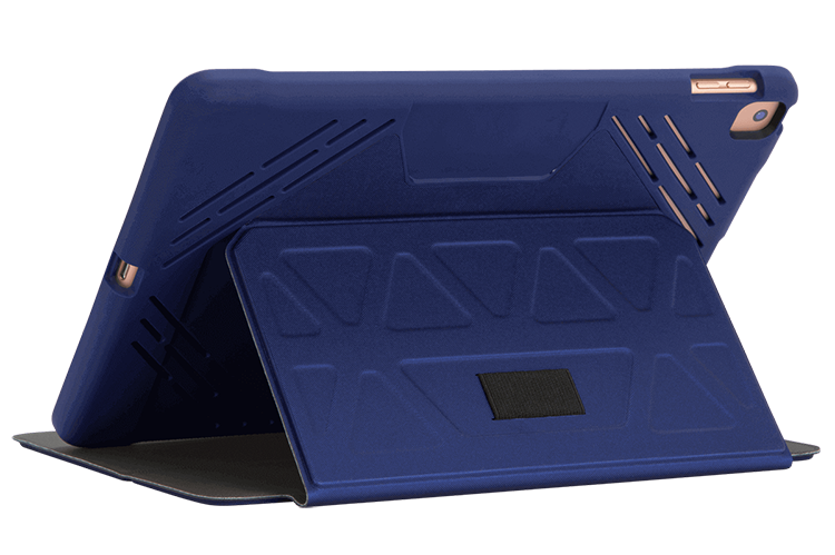 The Blue Pro-Tek Antimicrobial Case for iPad® (9th, 8th and 7th gen.) 10.2-inch features a flexible tray with wrap-around bezel and reinforced corners to ward off bumps and dings. Its flexible cradle fits iPad Air® 10.5-inch, and iPad Pro® 10.5-inch as well.