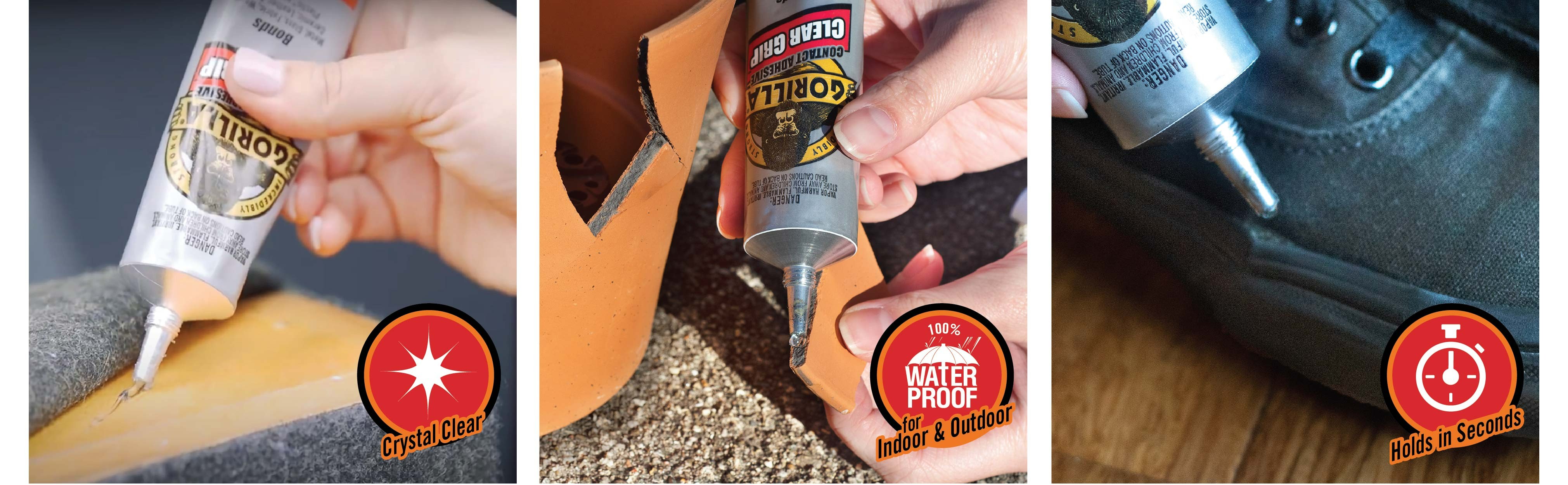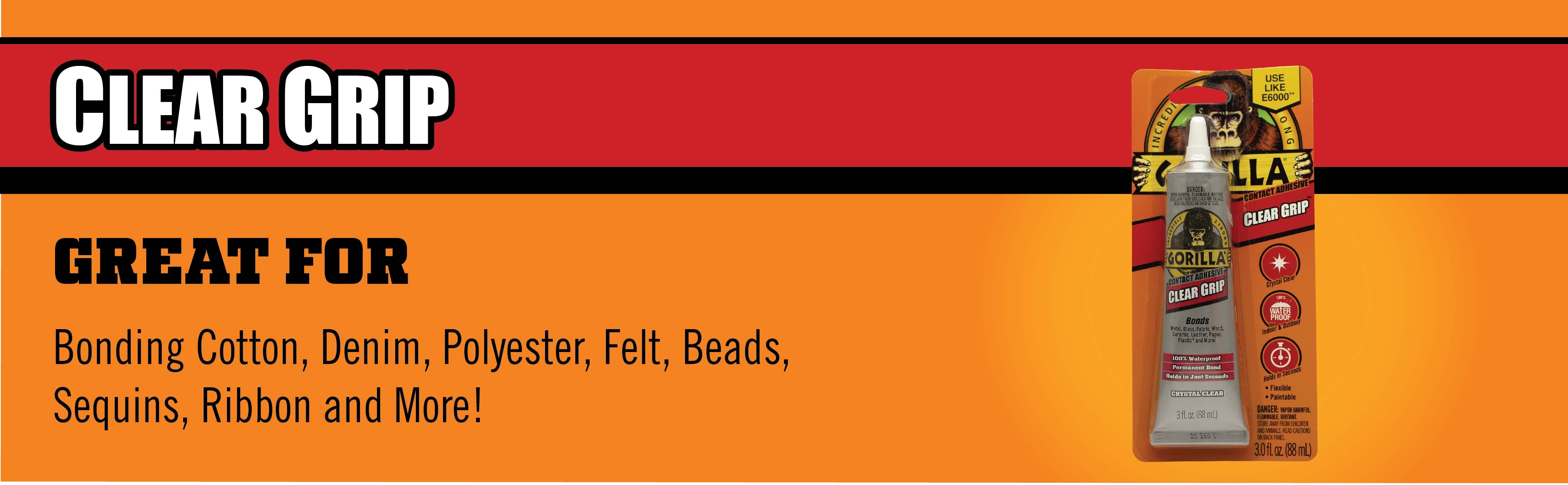 Gorilla Clear Grip® is a flexible, fast-setting, crystal clear contact adhesive that creates a strong, permanent bond. Gorilla Clear Grip is paintable and waterproof making it great for projects both inside and out! Build, create, repair.