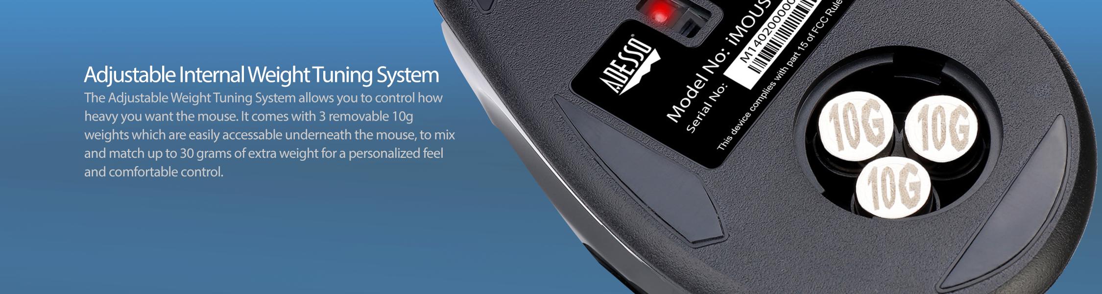 The Adjustable Weight Tuning System allows you to control how heavy you want the mouse. It comes with 3 removable 10g weights, to mix and match up to 30 grams of extra weight for a personalized feel and comfortable control.