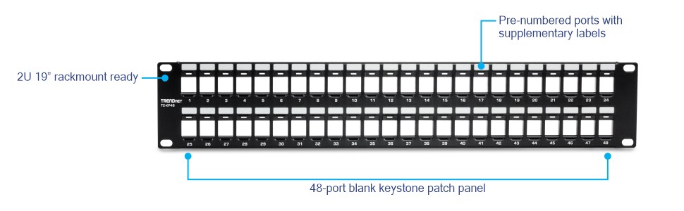 The 48-port blank 2U keystone patch panel is designed for use with TRENDnet's Cat6 keystone connectors (sold separately).