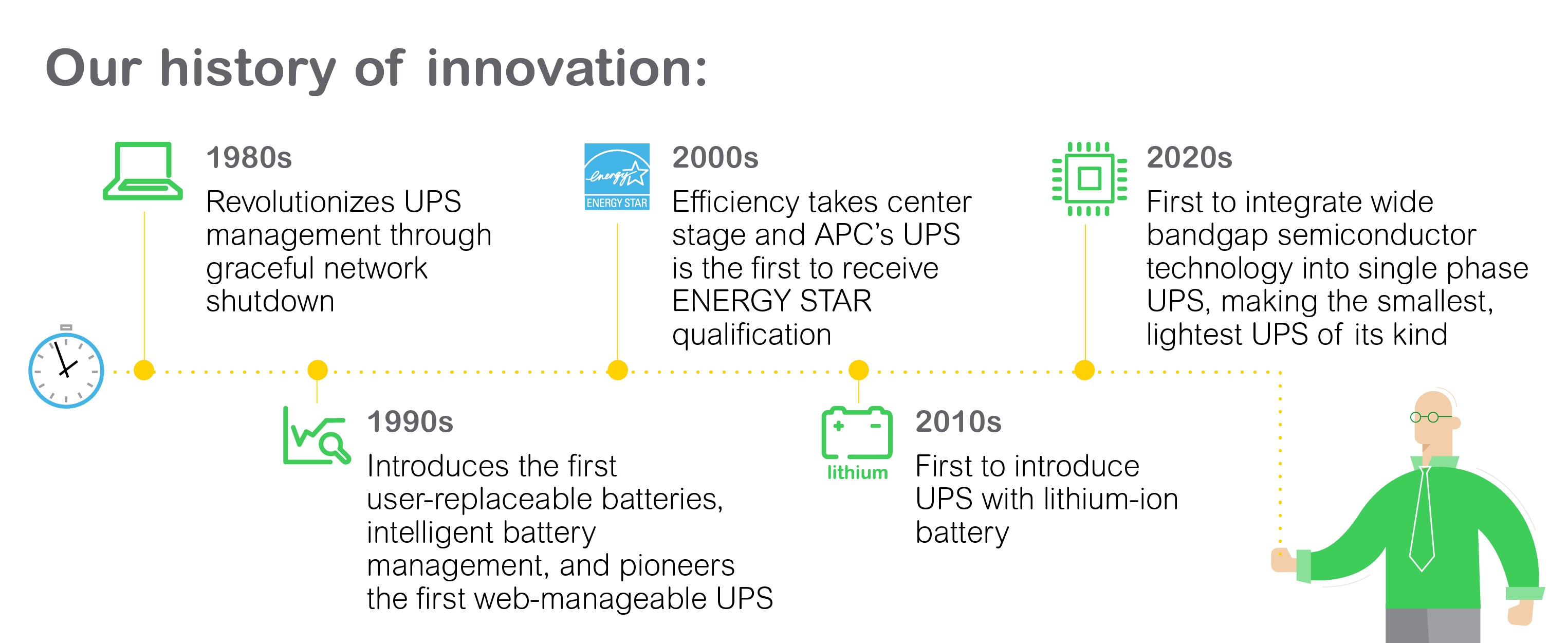 APC, a flagship brand of Schneider Electric, provides clean battery backup power, surge protection, and IT physical infrastructure inside and outside the traditional IT environment. Through our APC brand products and solutions, we offer certainty in a connected world. Certainty that our reliable, integrated physical infrastructure solutions are based on the fundamental premise that your data and information should — and always will be — accessible.